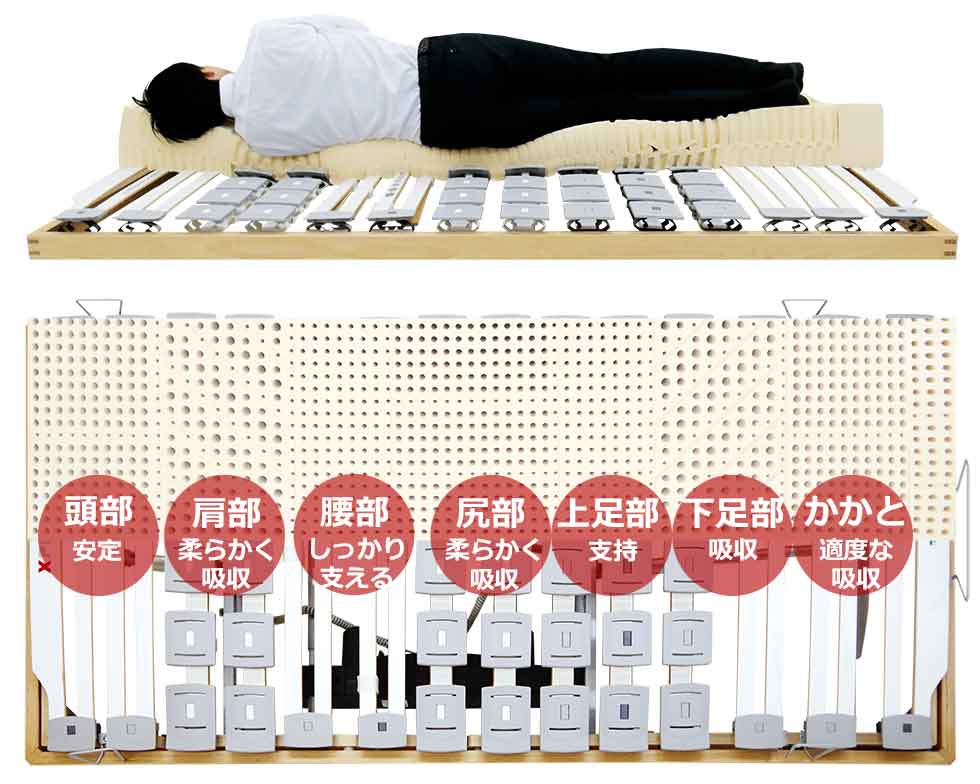 - 7つのゾーンが人の寝姿勢を立っている姿勢に近い姿勢で寝ることを可能にし快適睡眠を実現