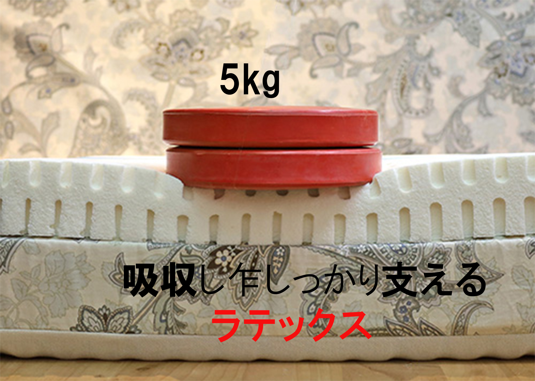 少ない面で同じ荷重をラテックスフォームと低反発トゥルースリーパーマットレスにかけて比較しました。ダンベルプレート1個の重さ :2.5kgx2=5kg