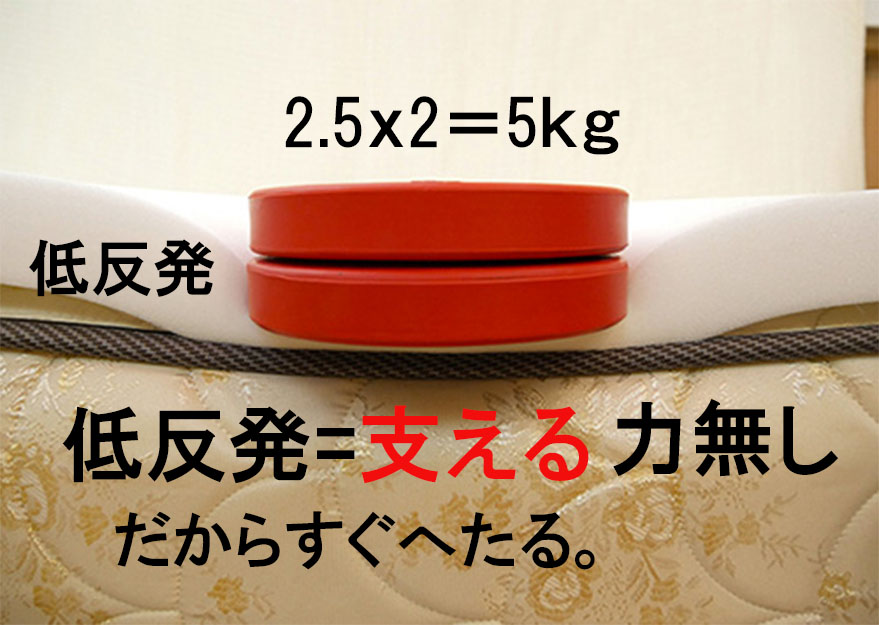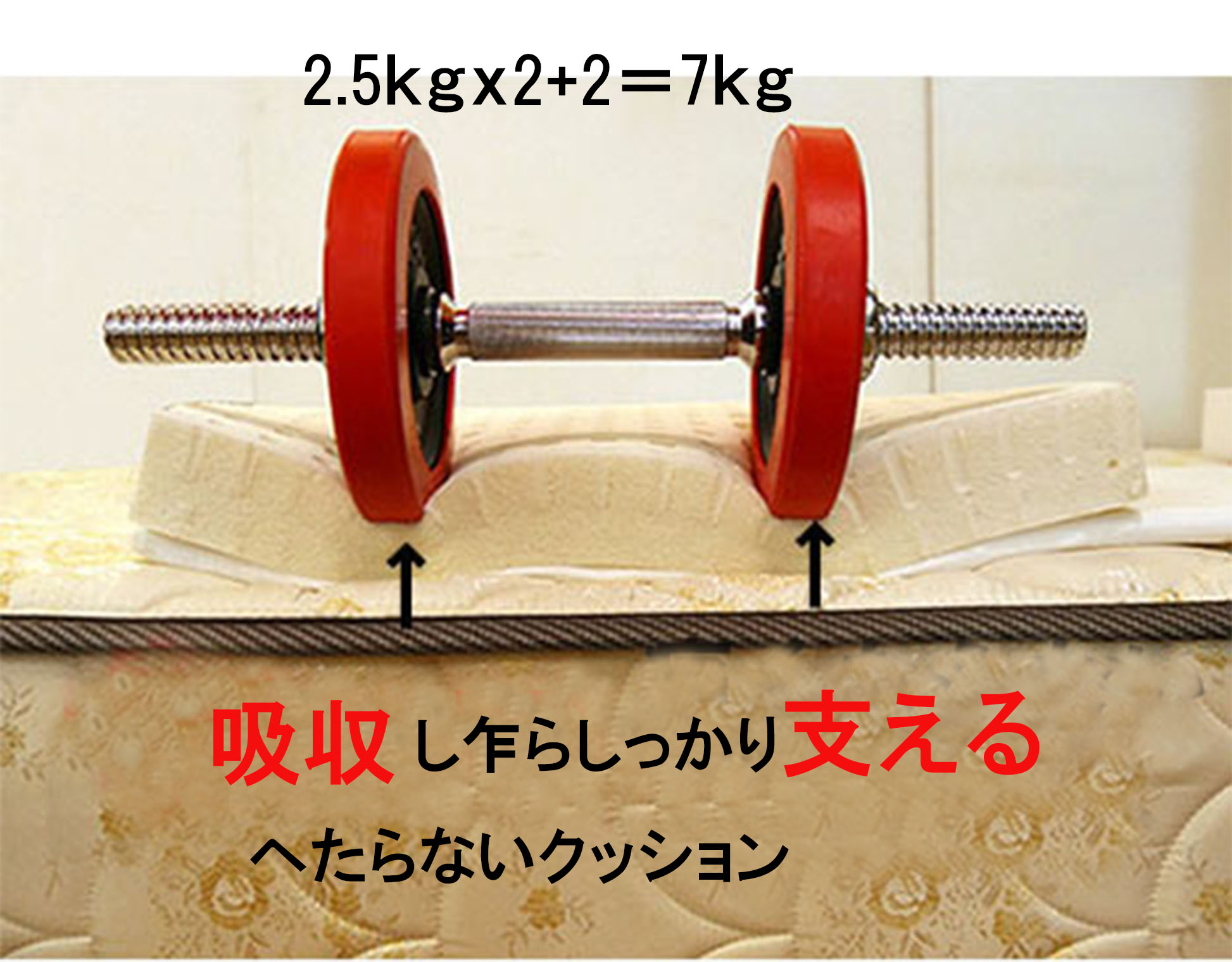 同じ荷重を広い面積でラテックスフォームと低反発トゥルースリーパーマットレスにかけて比較しました。ダンベルプレート1個の重さ :2.5kgx2枚